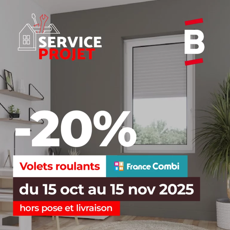 Profitez de -20 % sur les volets roulants France Combi, adaptés à votre habitat et installés par nos partenaires du Service Projet Bricomarché.